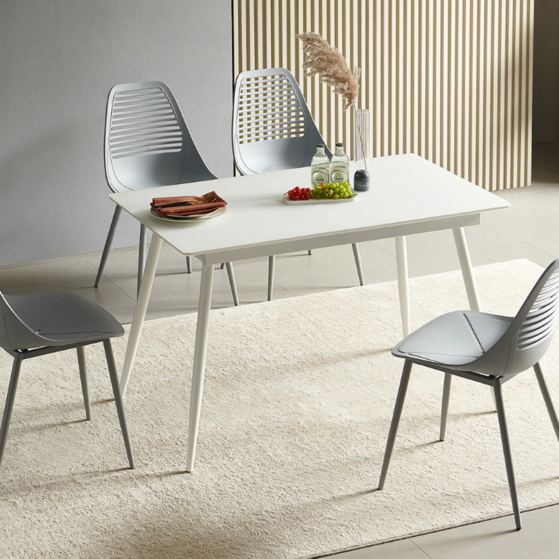 משטח עליון של השולחן מלמין, משענת הכיסאות סנדוויץ, מושה הכיסאות בריפוד איכותי, ניקל איכותי מאוד.